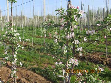 莫迪品种来源于意大利,是自由和嘎啦的自然杂交种中选育。该品种数势中庸,易成花,意大利的种植者对其评价是个“非常友好的品种”,因此莫迪品种在我国的表现备受关注。 宝鸡华圣果业有限责任公司2015年首次引进莫迪品种矮化自根砧大苗,砧木为脱毒M9T337,于2015年4月定植于陕西省千阳县种植基地。 经过一年时间的观察,莫迪品种表现良好,经统计定植第一年单株挂果5-7个,株高增加40-50cm,花芽饱满。定植第二年物候期与富士一致,单株花量达35-40个。 2015年冬 2016年春疏花后 花芽膨大期 花序分离期 疏花后 定植第二年莫迪盛花期 品种简介:http://baojihuasheng001.blog.163.com/blog/static/242948002201601411735588/