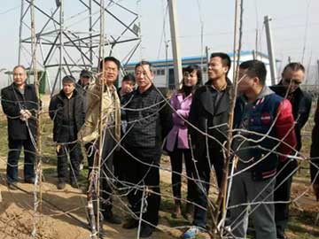 农业部科教司副司长石燕泉及科教司相关领导在西北农林科技大学农学院副院长杜世平、园艺学院千阳试验站站长李丙智教授、千阳县副县长崔省强的陪同下来宝鸡华圣果业基地进行调研。 在华圣基地调研期间,石司长参观了KINP大苗品种展示园及大苗繁育圃,基地王晓伟经理将公司发展规划及采用进口矮化自根砧大苗建园情况作了介绍。石燕泉副司长指出,将国外的先进种植模式在我国推广能加快我国农业现代化建设,应加快矮化自根砧苗木繁育工作,尽早繁育出优质苗木。李丙智教授也将宝鸡华圣公司与国内外高校合作的模式进行了介绍,石副司长一行对宝鸡华圣苗木培育质量及机械化程度给予高度评价。