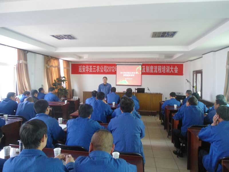 4月23日---25日,延安华圣三农科技服务有限公司在富县杨林宾馆五楼会议室,对三农公司所有管理人员共计94人,进行新版制度、2012年全年工作任务分解、三农公司发展中存在的问题及苹果产业发展变化进行统一培训。 会议由三农公司行政中心经理张秦川主持,三农公司常务副总经理梁治国对公司2012年三农公司整体业务工作开展进行了详细的安排部署;副总经理张林对三农公司新版制度、流程、考核等进行了详细的讲解培训;陈伟新教授对三农公司现阶段发展中存在的问题及苹果产业发展趋势进行了分析讲解。 通过任务工作分解培训为每位员工工作开展提供了思路,确保各项工作开展和公司整体方针、计划紧密相连,更好的完成本年度各项工作;通过制度、流程的培训使各位员工能更好的了解公司工作开展的标准要求,规范自身行为,确保工作按计划落实。