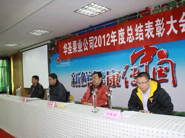2013年2月6日上午10点,在果业公司二楼培训中心多功能会议室隆重召开了华圣果业2012年度总结表彰大会。出席本次会议的有:果业公司领导,国内营销公司和三农科技服务公司负责人以及员工代表、果业工厂全体员工。