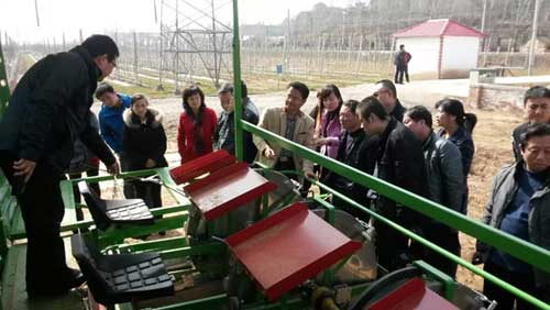 2015年3月8日,西安市各区县果业技术推广部门负责人50多人在张创新主任的带领下参观了宝鸡华圣千阳基地。旨在学习了解先进的果园管理技术和机械化生产模式。基地王晓伟经理介绍了华圣公司发展情况及千阳基地建设规划,对基地大苗示范园、种苗培育圃以及水肥一体化系统作了介绍,并演示了进口机械操作。