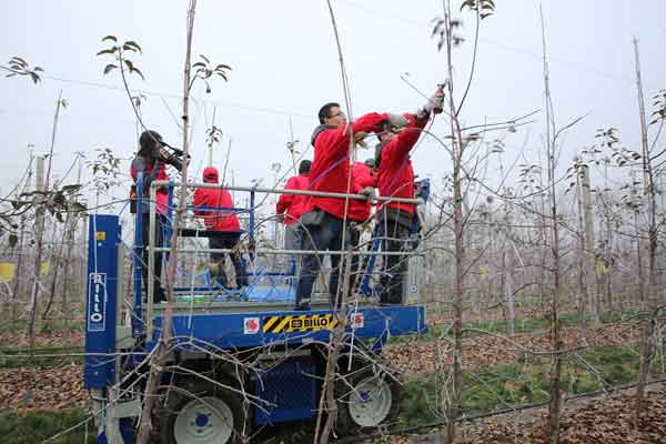 记者一行在基地负责人的陪同下来到展示园内,此时正值公司开展果树冬季修剪工作,记者看到4名技术人员在修剪平台上对果树进行冬剪,修剪平台配备气剪,每分钟可修剪约16棵果树,工作效率极高给人留下深刻印象,记者对现场进行了影像拍摄。随后,记者采访了基地负责人,就基地建设情况、苗圃和果园栽培管理技术进行详细了解。最后,一行人观摩了公司引进国外的先进设备,包括:种植机、起苗机、起垄机、除草剂机、采收平台等,并一一对设备功能特性进行介绍,设备精良,技术先进令人叹为观止。