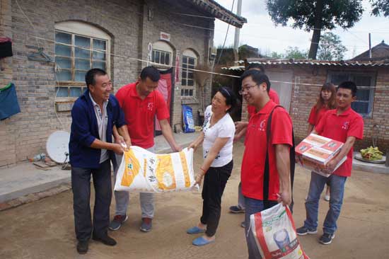 “7•15”宜川、延长严重风雹灾害发生后,华圣三农公司管理层立即向受灾区域总站人员了解当地灾情,随即就作出部署,要求受灾地区总站立即派技术人员和服务员深入受灾果区,了解灾情,掌握果农受灾第一手资料,并尽快制定出帮扶措施。同时,公司决定派出三路人员,分别由公司副总经理张林、总经理助理王建超、宜川大区经理段海涛带队,带着米面等慰问品及灾后补救措施宣传资料,深入宜川、延长风雹灾害重灾区农户家中,送上三农公司对果农的关心和慰问。